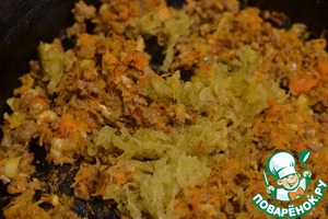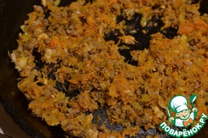 Добавить к морковке фарш, обжарить все вместе, слегка остудить.
