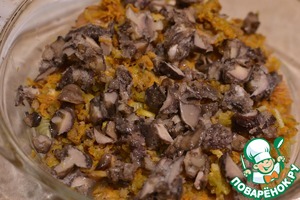 Макароны отварить в подсоленной воде, оставив их чуть-чуть недоваренными, самую капельку. Обжарить лук с морковкой. Если грибы сырые, то их можно обжарить отдельно, а можно вместе морковкой.