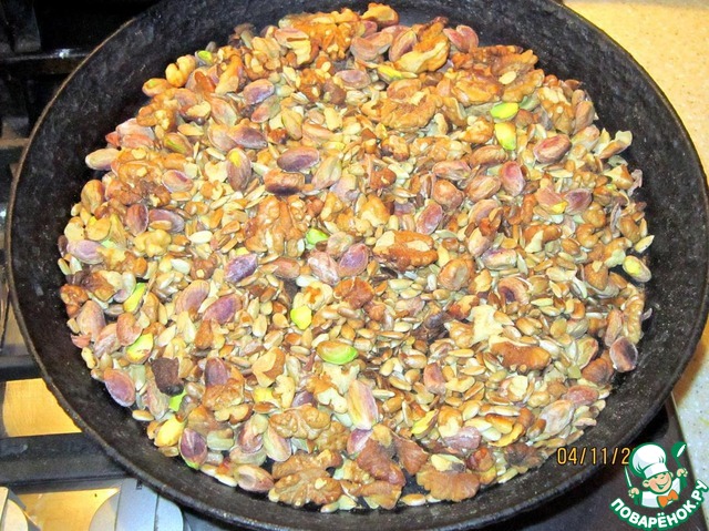 Обжариваем орехи на медленном огне 15-20 минут. Постоянно помешивая.