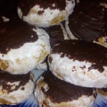 Теперь берём кастрюлю, кладём туда ещё горячие пряники, добавляем ложкой немного глазури, закрываем крышкой и трясём кастрюлю из стороны в сторону, вверх-вниз. Так как пряники горячие, то глазурь быстро сохнет на них. Потом укладываем пряники в один ряд, чтобы глазурь окончательно высохла.