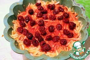 Выложить на тесто 1/3 яблок и часть вишни. -