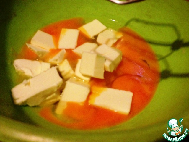 Взбить сливочное масло с сахаром и яйцами в однородную массу.