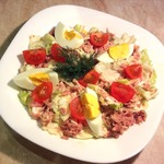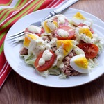 Все тщательно перемешиваем в миске вместе с заправкой. Выкладываем на блюдо для подачи. Верх украшаем кусочками оставшихся помидоров, дольками яиц и рыбой без кожи и костей. Каюсь, тунца у меня целая банка. Некуда было его пристроить. Подаем.