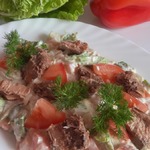 Использовала филе тунца (не консервированного! а замороженного филе): поперчила, посолила, и протушила в сковороде (можно и прожарить, но будет суховато...да и мне жареное нельзя)