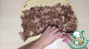Смазать пласт теста растопленным сливочным маслом, посыпать сахаром, какао, изюмом (изюм можно предварительно замочить, но я люблю именно суховатый изюм в тесте). Скрутить плотный рулет.