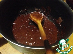 Приготовить глазурь. Смешать сахар, сметану и какао. Поставить на огонь. Готовить помешивания до закипания. Вмешать сливочное масло до растворения.