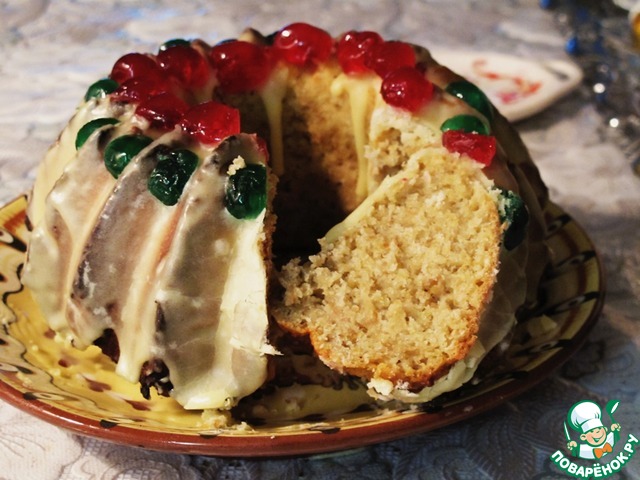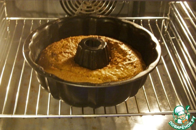 Ставим форму в разогретую до 180 град С духовку. Продолжительность выпекания 35 - 40 минут. Извлекаем форму из духовки и недолго охлаждаем кекс в форме. Вынимаем кекс из формы и слегка посыпаем сахарной пудрой.