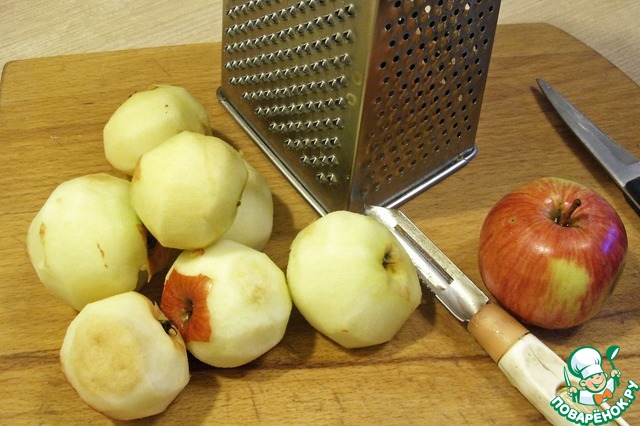 Яблоки чистим и натираем на тёрке. В миску с яблочным пюре добавляем сахар, изюм и растительное масло. Размешиваем.
