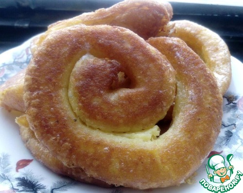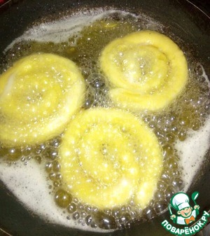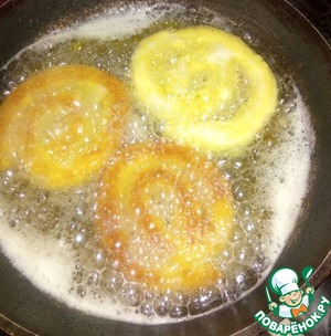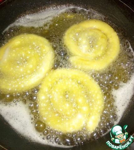 Складываем получившееся пюре в кулинарный мешок. Если специального мешка нет, вполне можно использовать обычный полиэтиленовый мешочек. Раскаляем растительное масло в сковороде. Выдавливаем из мешка пюре в виде спиральки. Обжариваем до румяной корочки.