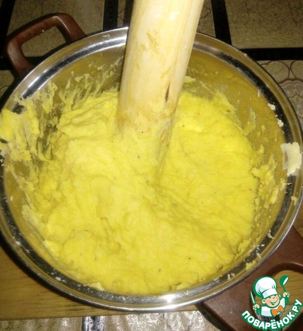 Отвариваем картофель, разминаем толкушкой. Добавляем в картофель яйца, тёртый сыр, муку, чеснок, соль, перец и хорошенько перемешиваем.