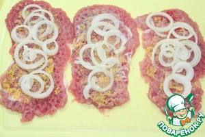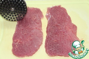 Мясо отбить толщиной не менее 1 см, можно и потолще, если куски большие. Я брала порционные свиные эскалопы, если брать говядину, то мясо может быть жестковато, с вырезкой, конечно, проблем не будет. Но с куриным филе и с филе индейки получается чудесно!