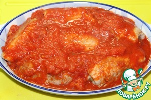 Залить томатным соусом, запекать в разогретой до 180 градусов духовке 30- 40 минут, в зависимости от выбранного мяса.