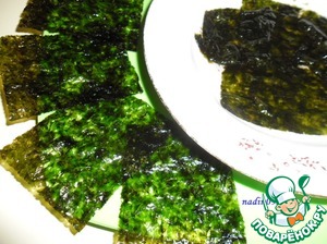 Предварительно замоченные пластины морской капусты измельчить. На фото видно, как они выглядели сухие и после замачивания.
