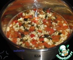 Нарезанные перец болгарский и капусту добавить в яичную кашку, перемешать, довести до кипения, проварить 1 минуту, снять с огня.
