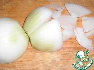 Готовим соус. Репчатый лук очистить, разрезать на четвертушки и нашинковать. В сковороде нагреть растительное масло ( 1 ст. л.), обжарить лук до легкой золотистости.