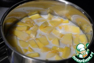 Пока филе запекается, ставим на огонь молоко. В горячее молоко выкладываем тыкву, закрываем крышкой и продолжаем варить.