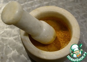 Молотый имбирь, перец чили и мускатный орех смалываем в ступке. Отправляем к тыкве.
