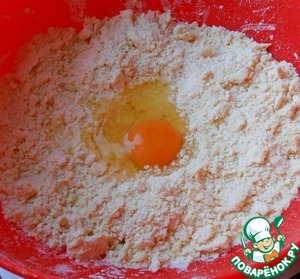 Сливочное масло порубить ножом с мукой, сахаром и разрыхлителем и растереть в крошку. Добавить яйцо, замесить тесто.