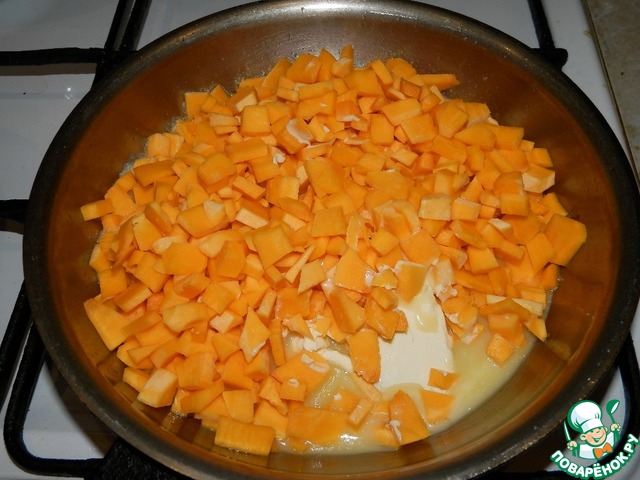 Тыкву очистить от кожуры и семян, нарезать маленькими кусочками. На сковороде растопить сливочное масло, выложить тыкву и тушить 1-2 минуты, помешивая.