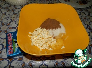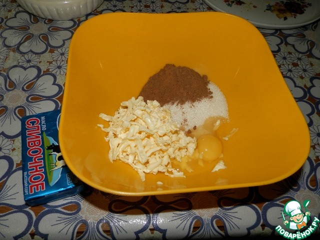 Пока остывает сливочная тыква, приготовим шоколадное тесто: холодное сливочное масло натереть на крупной тёрке, добавить сахар, 1 яйцо и какао.