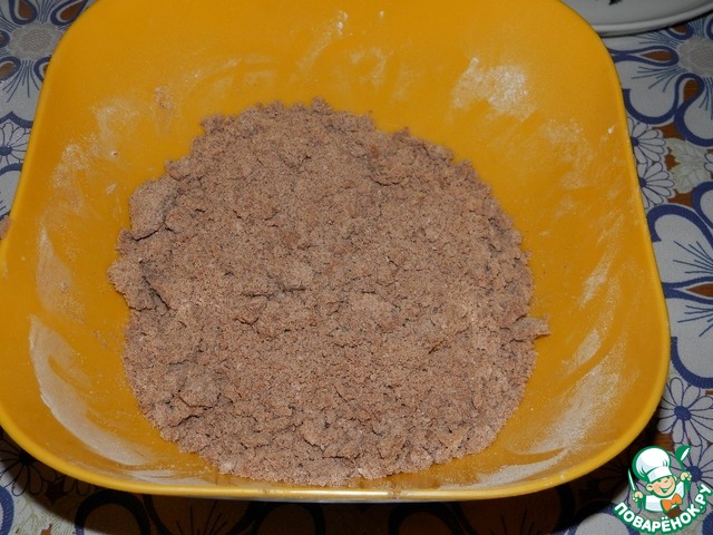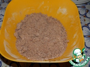 Всыпать муку, смешанную с разрыхлителем, ванильный сахар и растереть эту смесь в крошку.