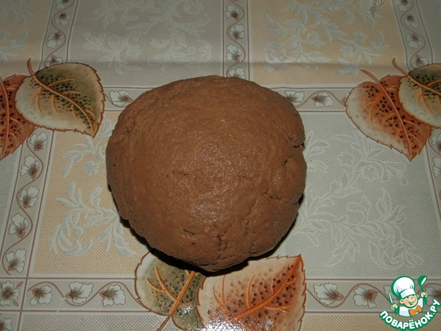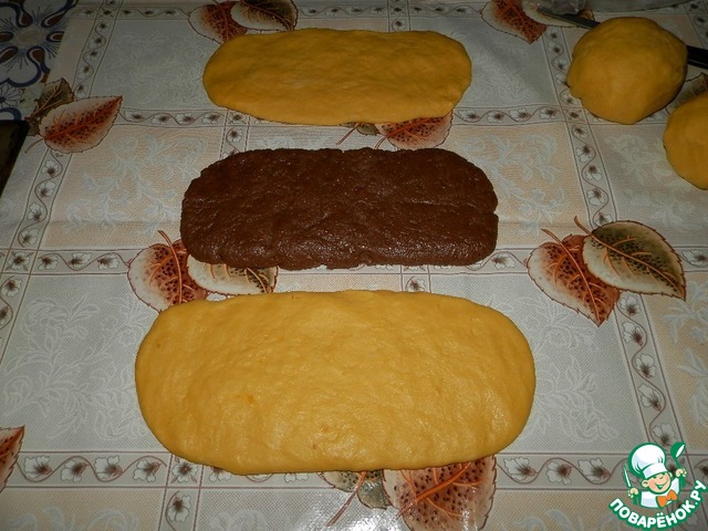 Раскатать или размять руками на столе 2 части тыквенного теста и 1 часть шоколадного теста на равные пласты. Толщиной 0,5 см.