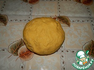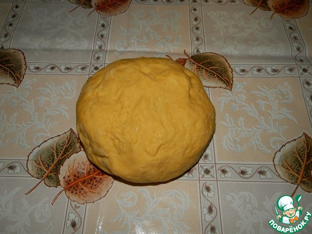 Приготовим тыквенное тесто: в остывшую тыквенно-сливочную массу всыпать муку, смешанную с разрыхлителем, замесить мягкое нежное тесто.