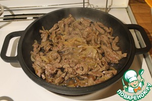 Треть лука отправляем в соус, остальной оставим на сковороде. На сковороду добавляем еще немного растительного масла (1 ст. л.) и на сильном нагреве обжариваем вырезку на луке.