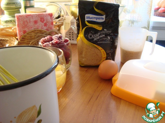 Берём всё, что нам пригодится для десерта. Малину выложила в стакан, чтобы она полностью разморозилась, пока печётся пирожок.