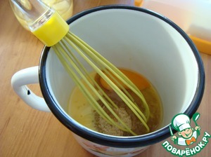 Делаем тесто. Разбиваем в посуду яйцо, добавляем желтки, насыпаем коричневый сахар, немного молока и ложку сока. Всё венчиком подвзбиваем.