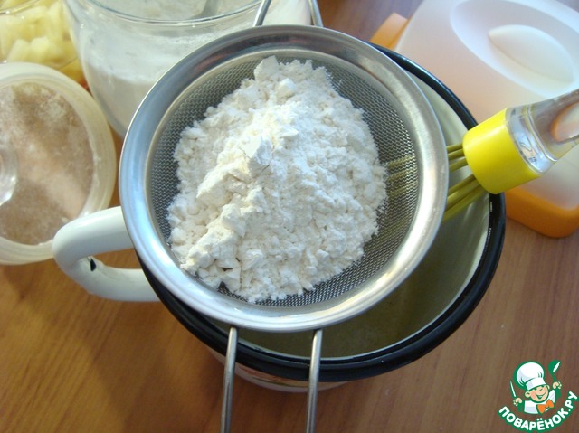 Муку соединила с разрыхлителем и просеяла через сито. По ложке вмешала в тесто.