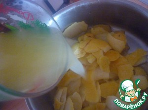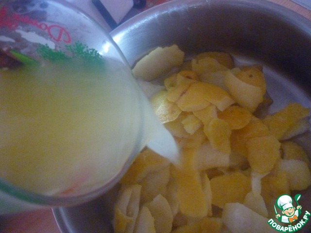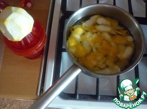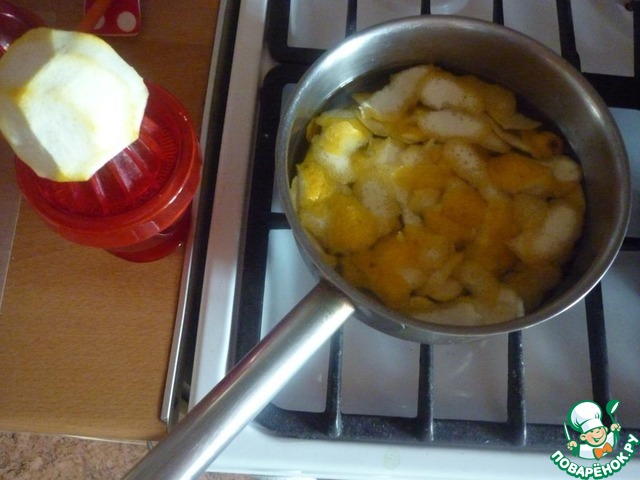 Цедру залить холодной водой, довести до кипения и откинуть на дуршлаг. Повторить 3 раза.