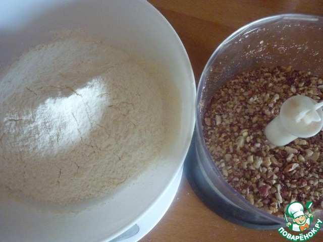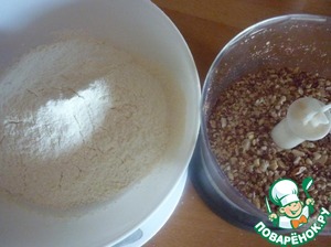 Добавить сок лимона, порциями всыпать молотые орехи и просеянную муку с разрыхлителем.