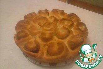 Из оставшегося теста вырезать любые украшения и произвольно выложить их поверх пирога. -