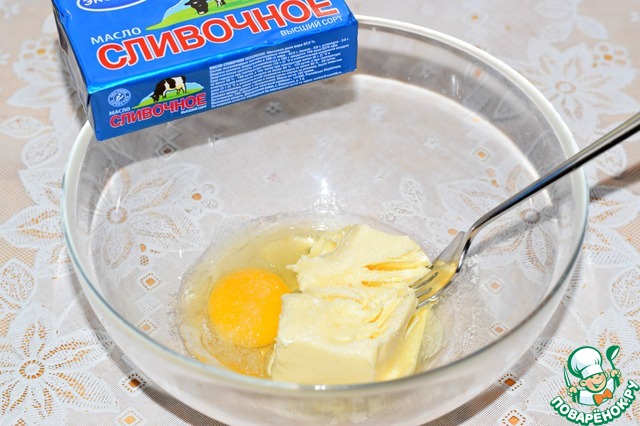 Размягченное сливочное масло (я использую сливочное масло ТМ "Экомилк" 82,5%) смешать с яйцом небольшого размера (С2), солью и сахаром. Полной однородности добиваться не надо, достаточно просто соединить ингредиенты.