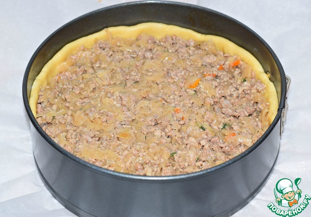 В форму с тестом равномерно выложить мясную начинку. Рукой или ложкой чуть утрамбовать ее.