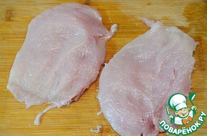 Куриную грудку разрежьте вдоль пополам и слегка отбейте.