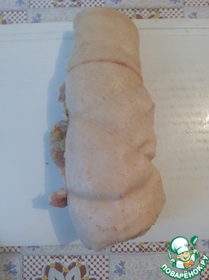 Также тщательно втираем маринад и сворачиваем подчеревок в рулет. Оба варианта убираем на ночь в холодильник.