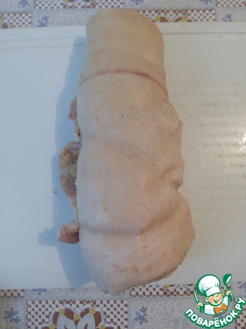 Закрываем форму фольгой. Запекаем в духовке около 1 часа (время зависит от размера подчеревка). Первые 30 минут при 200°, последующие 30 минут при 180°. За 10 минут до готовности убрать фольгудля того, чтобы рулет подрумянился. Хорош и в холодном и в горячем виде.