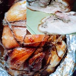 [+5]на следующий день запекла в фольге в форме 200 градусов 1 час, затем 180 градусов 2 часа, затем оставила на час в уже выключенной духовке (хотя можно и до полного остывания), затем убрала в холодильник. Очень вкусно и в горячем, и в холодном виде, и сок застыл в желе очень вкусный