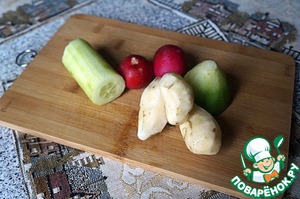 Топинамбур и редьку очистить, с огурца тоже снять кожуру (можно этого и не делать – смотря какой огурец).