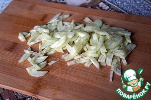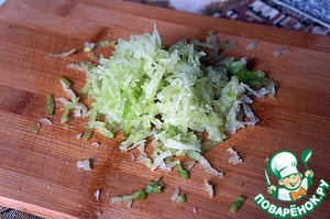 Огурец порезать тонкой соломкой. Если хотите – можете натереть на терке, но тогда он обильно пустит сок.