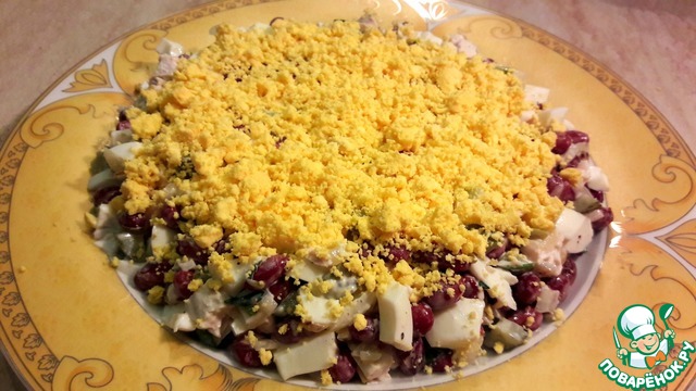 • Я выложила салат в квадратную кулинарную рамку, сверху посыпала желтком.