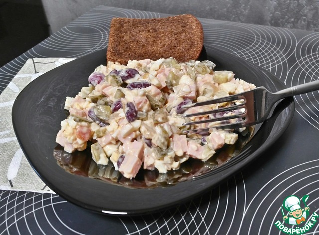 Салаты с фасолью я практически не делаю почему-то. А тут вот решила сделать для разнообразия. Всё по рецепту, только вместо варенной свинины положила варено-копченый карбонат, он тоже вполне неплохо вписался в салат. Впервые клала в салат жареный лук Результат понравился и мне и мужу. Вкусный сытный салатик. Буду готовить еще. В следующий раз обязательно попробую добавить шампиньоны, как советовали в комментариях.