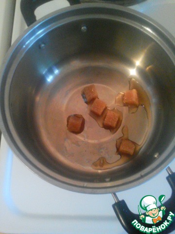 Кусочки сахара смачиваем водой и нагреваем в кастрюльке пока они не расплавятся.
