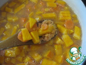 Разогреть бульон (или вскипятить воду), высыпать чечевицу. Персидская чечевица варится быстро, поэтому я сразу вместе с ней добавила тыкву и морковь, варим на среднем огне минут 15-20 до полной готовности овощей.