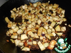 Обжариваем их. В сковороду налить масло, жарим сначала лук на среднем огне минуты 3, добавляем баклажаны и жарим до чуть золотистого цвета, еще примерно 5-7 минут.
