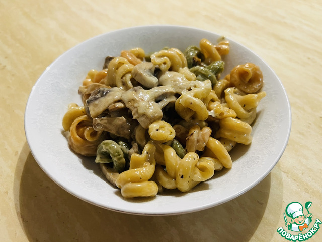 10. Добавляем в сковороду макароны, сливочный соус и тщательно перемешиваем