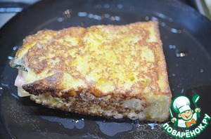 Молоко смешать с яйцом, окунуть туда хлеб и обжарить с двух сторон до хрустящего состояния.