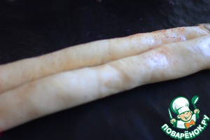 Белком смазать свободные края и скатать рулетом до середины, потом так же скатать рулет с другой стороны ( в результате у вас получится большой рулет, закатанный с двух сторон к центру. Рулет скрутить своей оси, как будто выжимаете белье. Старайтесь не повредить тесто, так как при выпечке потечет шоколад.